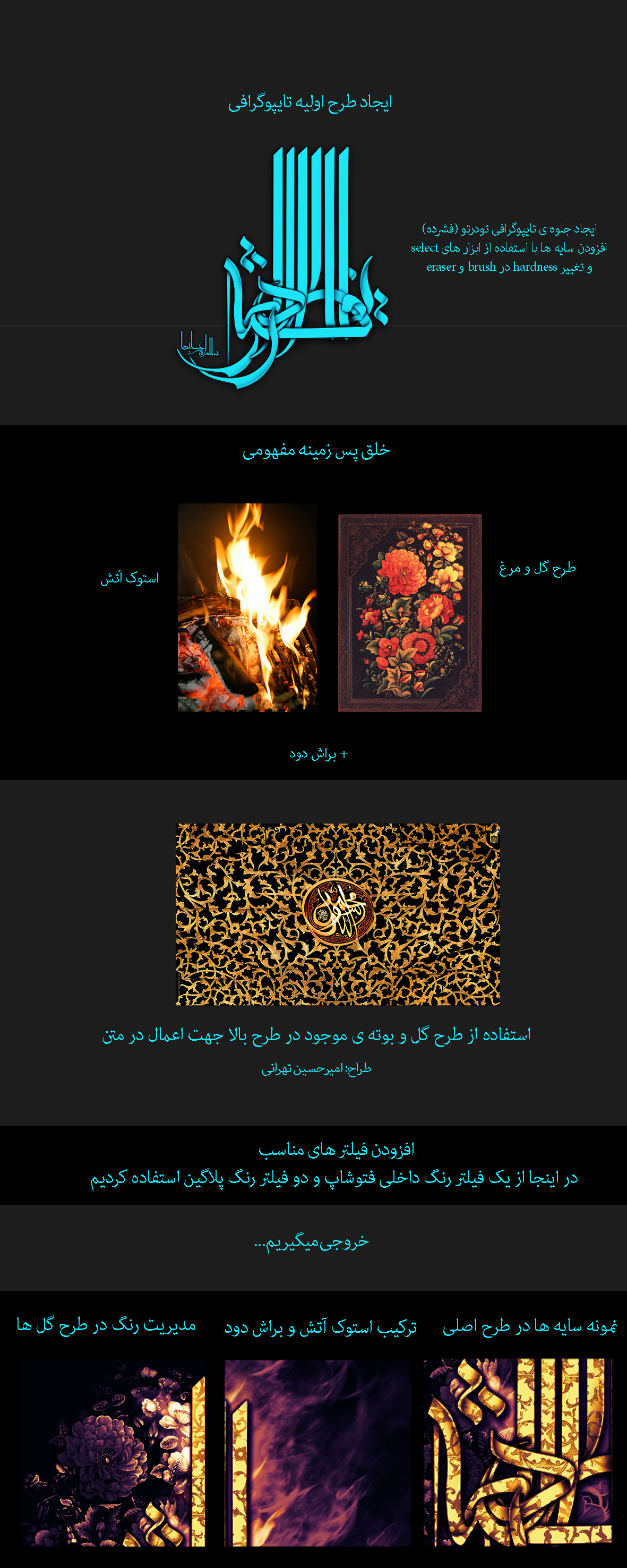 سلام علیکم کار زیبا و هنری هست اما تایپو رو قبول ندارم اصول یک تایپو زیبا اینکه در عین قشنگی اون خوانا باشه... ولی در کل من حض بردم از دیدنش چند ثانیه ای چشمهایمان به دنبال رنگ بندی های زیبا و ایده بسیار عالی گل و آتش در طرح میدوید و مات و مبهوت از آن احسنت بر ذهن خلاقتان انشاالله روز به روز درجات عالیه هنری و معنوی برسید برادر یاعلی مدد